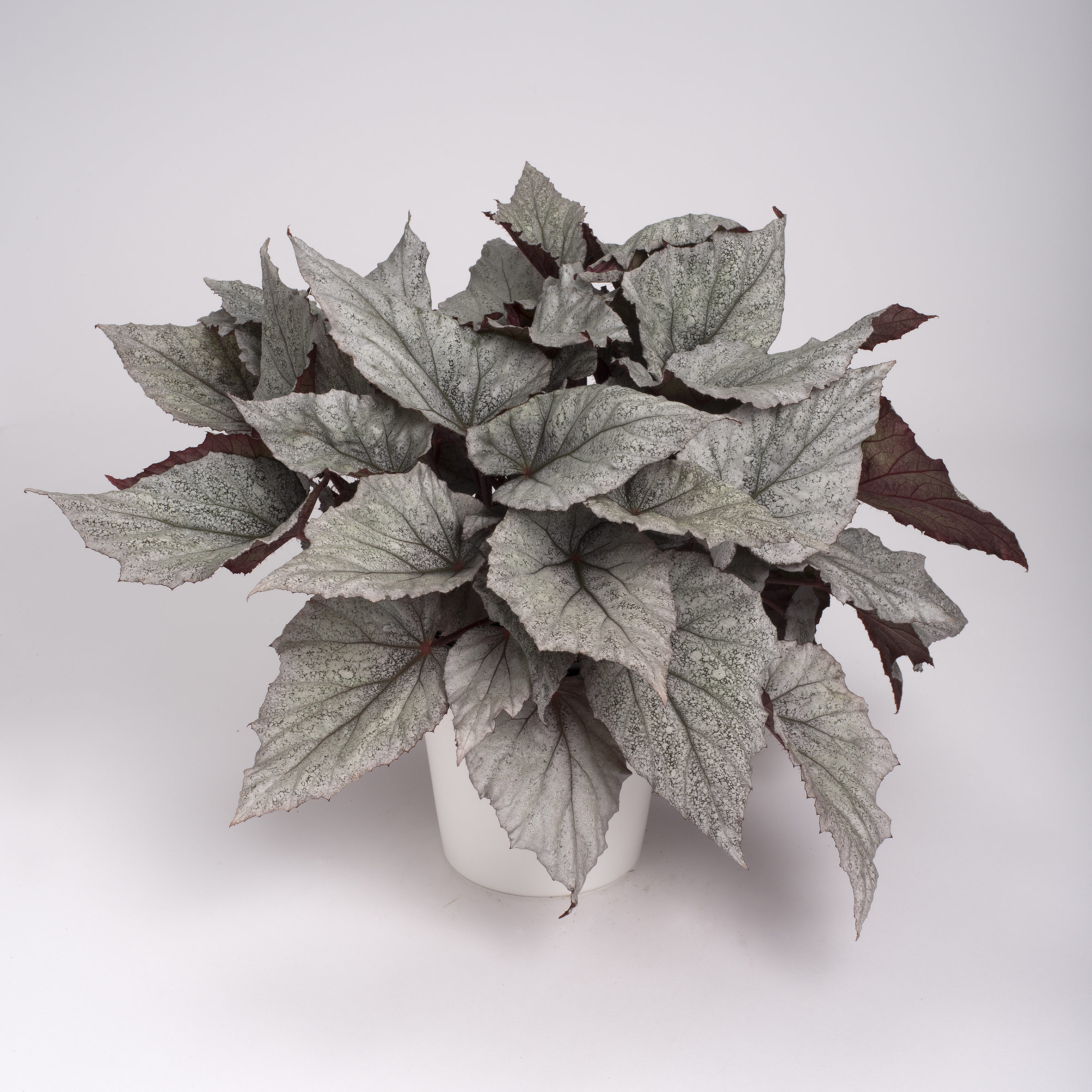 Begonia rex Beleaf™ Yukon Frost is a stunning variety with a covering of silver-white variegation on top of a deep green leaf.