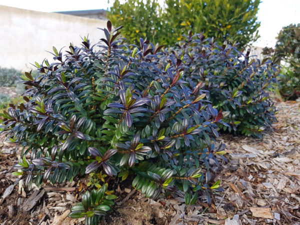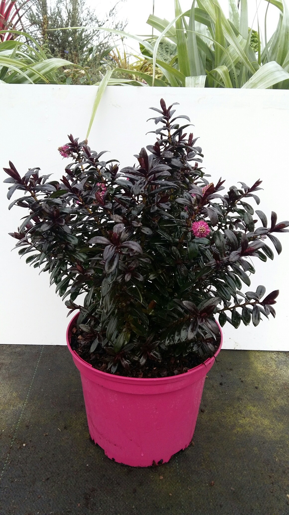 Hebe Black Satin is a compact, well branched variety with glossy, satin-like deep coloured foliage.