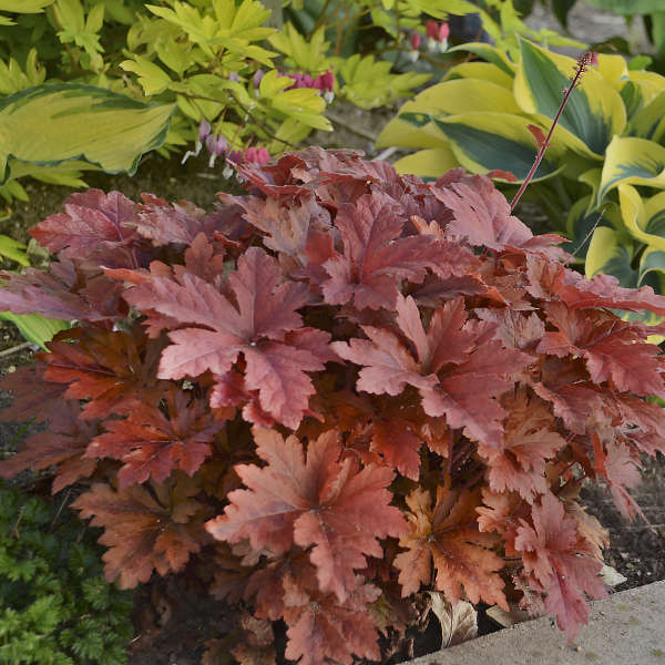 Heuchera Hopscotch has eye-catching scalloped leaves that emerge red with dark centers and lighten to bronze red.